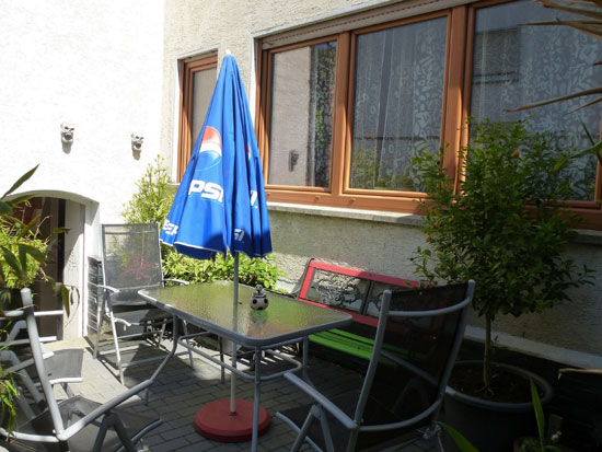 Gemütliche Grill- und Sitzmöglichkeit im grünen Innenhof.