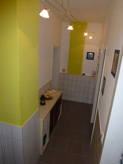 Badezimmer mit WC, Dusche und Waschmaschine.