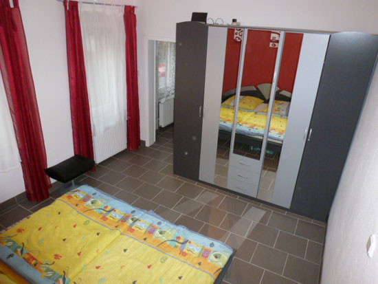 Schönes geräumiges Schlafzimmer mit Doppelbett, Kinderbett, 2 Nachttischen, Kleiderschrank und Wecker.