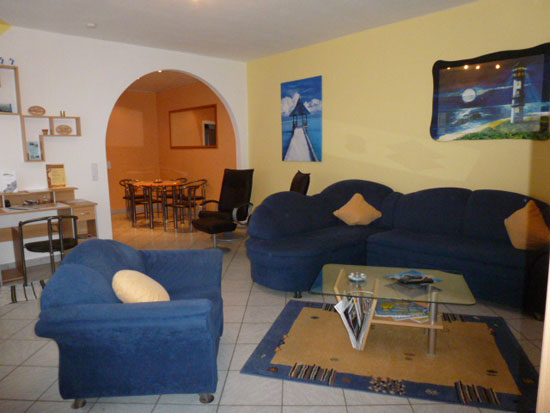 großes gemütliches Wohnzimmer mit Couch, Schreibtisch, Satelliten-TV, DVD Player und Stereoanlage.